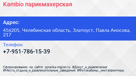 Kambio, парикмахерская по адресу 456205, Челябинская область, Златоуст, Павла Аносова, 217 в дальнейшем Организация, размещена в следующих категориях: