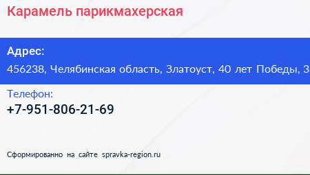 Карамель, парикмахерская по адресу 456238, Челябинская область, Златоуст, 40 лет Победы, 38 в дальнейшем Организация, размещена в следующих категориях: