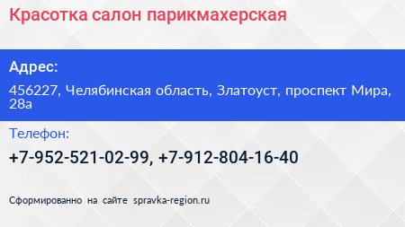 Красотка, салон-парикмахерская по адресу 456227, Челябинская область, Златоуст, проспект Мира, 28а в дальнейшем Организация, размещена в следующих категориях: