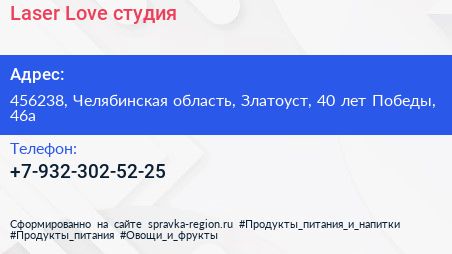 Laser Love, студия по адресу 456238, Челябинская область, Златоуст, 40 лет Победы, 46а в дальнейшем Организация, размещена в следующих категориях: