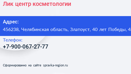Лик, центр косметологии по адресу 456238, Челябинская область, Златоуст, 40 лет Победы, 43 в дальнейшем Организация, размещена в следующих категориях: