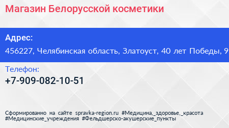 Магазин Белорусской косметики по адресу 456227, Челябинская область, Златоуст, 40 лет Победы, 9 в дальнейшем Организация, размещена в следующих категориях: