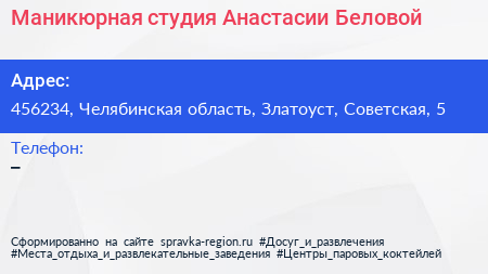 Маникюрная студия Анастасии Беловой по адресу 456234, Челябинская область, Златоуст, Советская, 5 в дальнейшем Организация, размещена в следующих категориях: