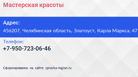 Мастерская красоты по адресу 456207, Челябинская область, Златоуст, Карла Маркса, 47 в дальнейшем Организация, размещена в следующих категориях: