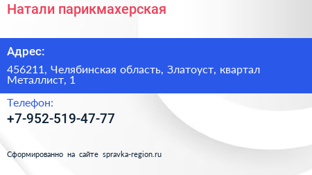 Натали, парикмахерская по адресу 456211, Челябинская область, Златоуст, квартал Металлист, 1 в дальнейшем Организация, размещена в следующих категориях: