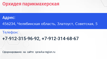 Орхидея, парикмахерская по адресу 456234, Челябинская область, Златоуст, Советская, 5 в дальнейшем Организация, размещена в следующих категориях: