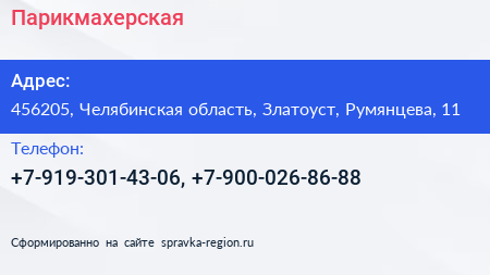 Парикмахерская по адресу 456205, Челябинская область, Златоуст, Румянцева, 11 в дальнейшем Организация, размещена в следующих категориях: