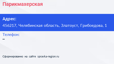 Парикмахерская по адресу 456217, Челябинская область, Златоуст, Грибоедова, 1 в дальнейшем Организация, размещена в следующих категориях: