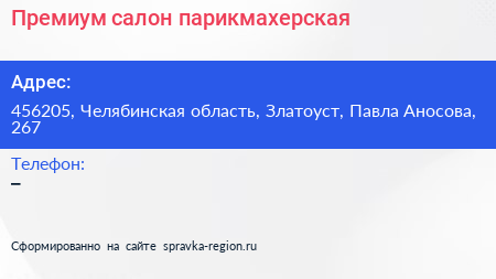 Премиум, салон-парикмахерская по адресу 456205, Челябинская область, Златоуст, Павла Аносова, 267 в дальнейшем Организация, размещена в следующих категориях: