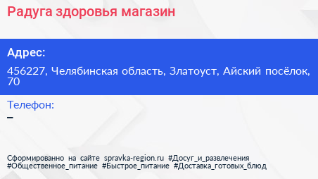 Радуга здоровья, магазин по адресу 456227, Челябинская область, Златоуст, Айский посёлок, 70 в дальнейшем Организация, размещена в следующих категориях: