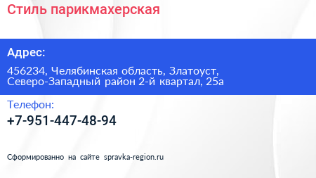 Стиль, парикмахерская по адресу 456234, Челябинская область, Златоуст, Северо-Западный район 2-й квартал, 25а в дальнейшем Организация, размещена в следующих категориях: