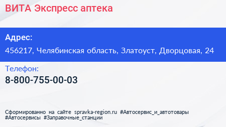 ВИТА Экспресс, аптека по адресу 456217, Челябинская область, Златоуст, Дворцовая, 24 в дальнейшем Организация, размещена в следующих категориях: