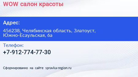 WOW, салон красоты по адресу 456238, Челябинская область, Златоуст, Южно-Есаульская, 6а в дальнейшем Организация, размещена в следующих категориях: