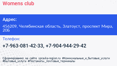 Womens club по адресу 456209, Челябинская область, Златоуст, проспект Мира, 20Б в дальнейшем Организация, размещена в следующих категориях: