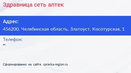 Здравница, сеть аптек по адресу 456200, Челябинская область, Златоуст, Косотурская, 1 в дальнейшем Организация, размещена в следующих категориях: