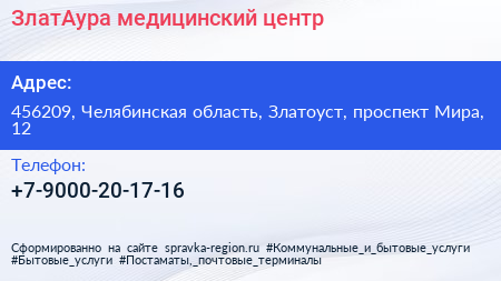 ЗлатАура, медицинский центр по адресу 456209, Челябинская область, Златоуст, проспект Мира, 12 в дальнейшем Организация, размещена в следующих категориях: