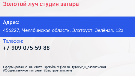 Золотой луч, студия загара по адресу 456227, Челябинская область, Златоуст, Зелёная, 12а в дальнейшем Организация, размещена в следующих категориях: