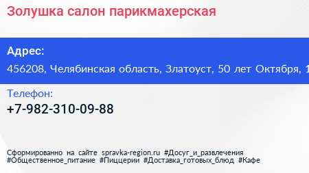 Золушка, салон-парикмахерская по адресу 456208, Челябинская область, Златоуст, 50 лет Октября, 1 в дальнейшем Организация, размещена в следующих категориях: