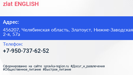 zlat.ENGLISH по адресу 456207, Челябинская область, Златоуст, Нижне-Заводская 2-я, 57а в дальнейшем Организация, размещена в следующих категориях: