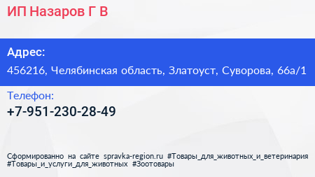ИП Назаров Г.В. по адресу 456216, Челябинская область, Златоуст, Суворова, 66а/1 в дальнейшем Организация, размещена в следующих категориях: