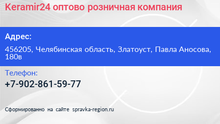 Keramir24, оптово-розничная компания по адресу 456205, Челябинская область, Златоуст, Павла Аносова, 180в в дальнейшем Организация, размещена в следующих категориях: