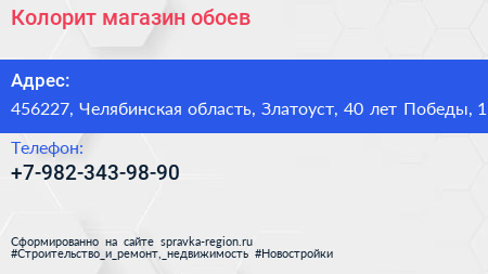 Колорит, магазин обоев по адресу 456227, Челябинская область, Златоуст, 40 лет Победы, 11 в дальнейшем Организация, размещена в следующих категориях: