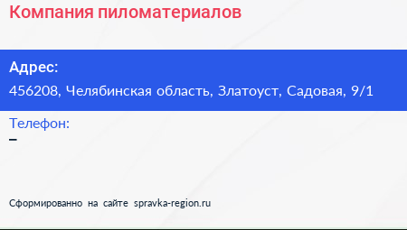 Компания пиломатериалов по адресу 456208, Челябинская область, Златоуст, Садовая, 9/1 в дальнейшем Организация, размещена в следующих категориях:
