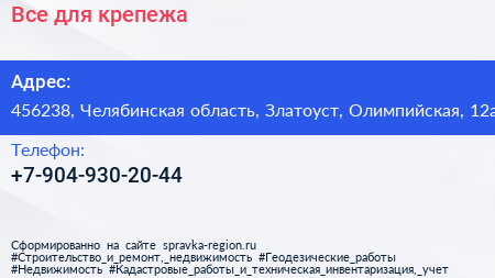 Все для крепежа по адресу 456238, Челябинская область, Златоуст, Олимпийская, 12а в дальнейшем Организация, размещена в следующих категориях: