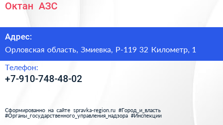 Октан+, АЗС по адресу Орловская область, Змиевка, Р-119 32 Километр, 1 в дальнейшем Организация, размещена в следующих категориях: