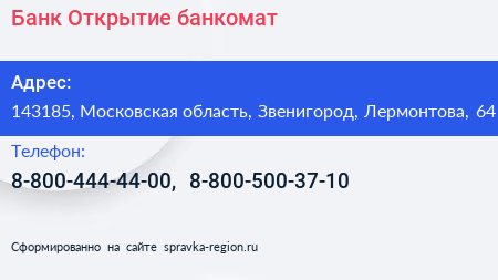 Банк Открытие, банкомат по адресу 143185, Московская область, Звенигород, Лермонтова, 64 в дальнейшем Организация, размещена в следующих категориях: