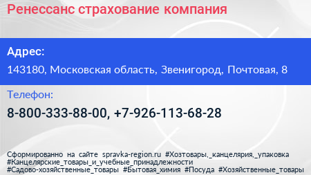 Ренессанс страхование, компания по адресу 143180, Московская область, Звенигород, Почтовая, 8 в дальнейшем Организация, размещена в следующих категориях: