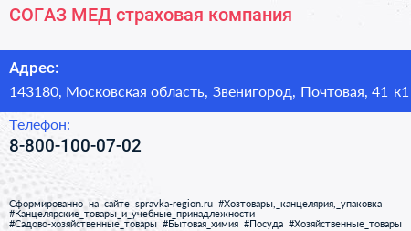 СОГАЗ-МЕД, страховая компания по адресу 143180, Московская область, Звенигород, Почтовая, 41 к1 в дальнейшем Организация, размещена в следующих категориях: