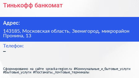 Тинькофф, банкомат по адресу 143185, Московская область, Звенигород, микрорайон Пронина, 13 в дальнейшем Организация, размещена в следующих категориях: