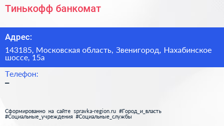 Тинькофф, банкомат по адресу 143185, Московская область, Звенигород, Нахабинское шоссе, 15а в дальнейшем Организация, размещена в следующих категориях: