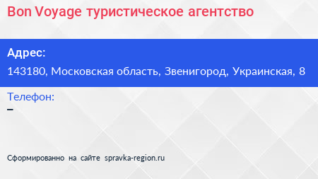 Bon Voyage, туристическое агентство по адресу 143180, Московская область, Звенигород, Украинская, 8 в дальнейшем Организация, размещена в следующих категориях: