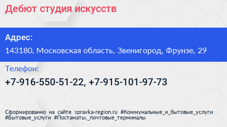 Дебют, студия искусств по адресу 143180, Московская область, Звенигород, Фрунзе, 29 в дальнейшем Организация, размещена в следующих категориях: