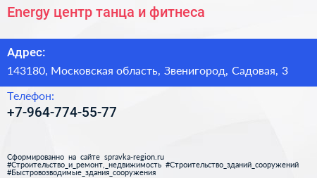 Energy, центр танца и фитнеса по адресу 143180, Московская область, Звенигород, Садовая, 3 в дальнейшем Организация, размещена в следующих категориях: