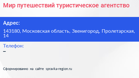 Мир путешествий, туристическое агентство по адресу 143180, Московская область, Звенигород, Пролетарская, 14 в дальнейшем Организация, размещена в следующих категориях: