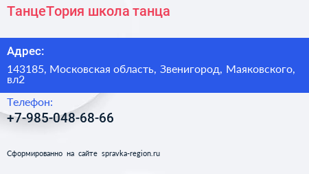 ТанцеТория, школа танца по адресу 143185, Московская область, Звенигород, Маяковского, вл2 в дальнейшем Организация, размещена в следующих категориях: