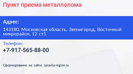 Пункт приема металлолома по адресу 143180, Московская область, Звенигород, Восточный микрорайон, 12 ст5 в дальнейшем Организация, размещена в следующих категориях: