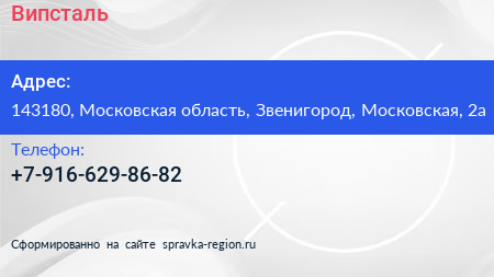 Випсталь по адресу 143180, Московская область, Звенигород, Московская, 2а в дальнейшем Организация, размещена в следующих категориях: