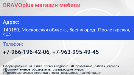 BRAVOplus, магазин мебели по адресу 143180, Московская область, Звенигород, Пролетарская, 40а в дальнейшем Организация, размещена в следующих категориях: