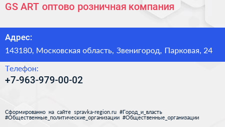 GS-ART, оптово-розничная компания по адресу 143180, Московская область, Звенигород, Парковая, 24 в дальнейшем Организация, размещена в следующих категориях: