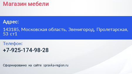 Магазин мебели по адресу 143185, Московская область, Звенигород, Пролетарская, 53 ст1 в дальнейшем Организация, размещена в следующих категориях: