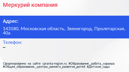 Меркурий, компания по адресу 143180, Московская область, Звенигород, Пролетарская, 40а в дальнейшем Организация, размещена в следующих категориях: