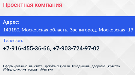 Проектная компания по адресу 143180, Московская область, Звенигород, Московская, 19 в дальнейшем Организация, размещена в следующих категориях: