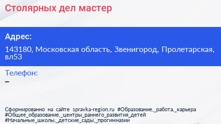 Столярных дел мастер по адресу 143180, Московская область, Звенигород, Пролетарская, вл53 в дальнейшем Организация, размещена в следующих категориях: