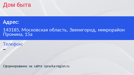 Дом быта по адресу 143185, Московская область, Звенигород, микрорайон Пронина, 15а в дальнейшем Организация, размещена в следующих категориях: