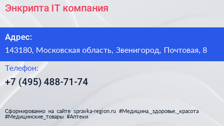 Энкрипта, IT-компания по адресу 143180, Московская область, Звенигород, Почтовая, 8 в дальнейшем Организация, размещена в следующих категориях: