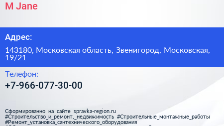 M.Jane по адресу 143180, Московская область, Звенигород, Московская, 19/21 в дальнейшем Организация, размещена в следующих категориях: